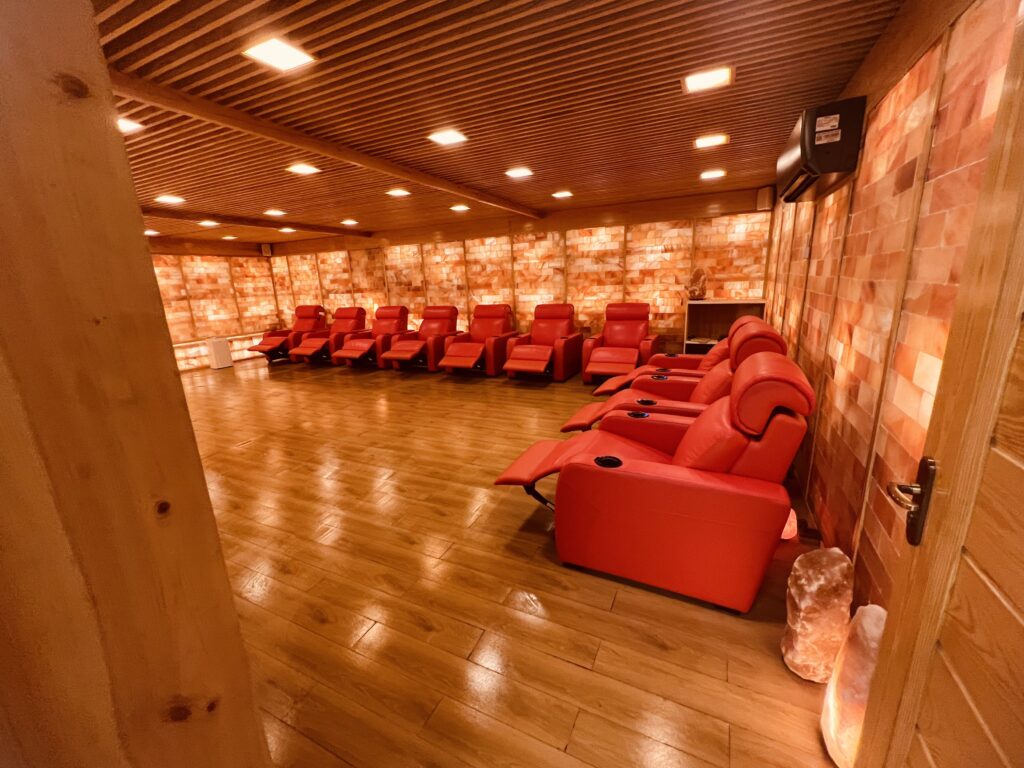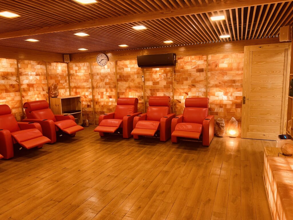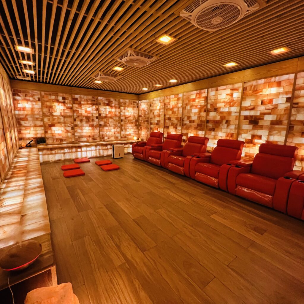 Every wall is fully covered with Himalayan salt, combining nature, science, and art without synthetic materials.
